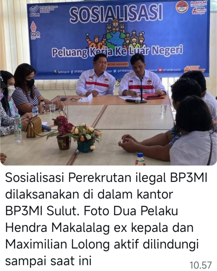“KASUS BESAR MELIBATKAN PARA PELAKU YANG TIDAK LAIN ADALAH EX KEPALA BP3MI SULUT HENDRA MAKALALAG” dan Pegawai MAXIMILIAN LOLONG, ROCKY MUMEK, JORDY SUBEKTI yang sampai saat ini bebas beraksi membuat para agen agen merasa nyaman beraksi karena sekelas POLDA SULUT dan BP3MI ikut mengawal pelaku sementara para korban dibiarkan tanpa rasa kemanusian.