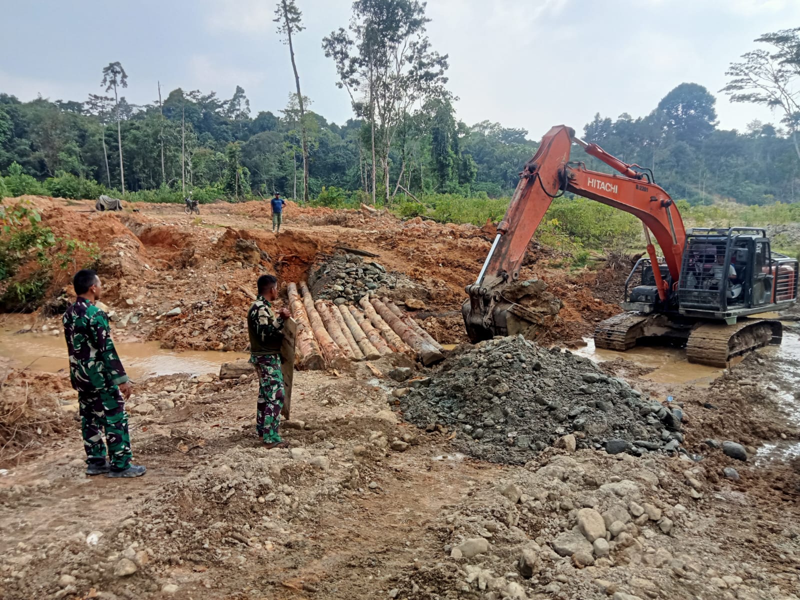 Kapten Inf Amrin yang berada di lokasi menjelaskan bahwa pembuatan drainase serta jembatan darurat merupakan tahap penting agar jalan yang dibangun nantinya memiliki daya tahan yang baik.