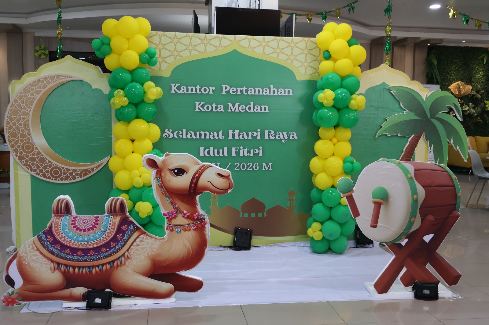 Penataan loket layanan dilakukan di ruang pelayanan Kantor Pertanahan Kota Medan dengan menambahkan berbagai elemen dekorasi bernuansa Idul Fitri. Selain memperindah tampilan ruang, pembenahan juga mencakup penataan ulang area antrean dan ruang tunggu agar lebih tertib dan efisien.