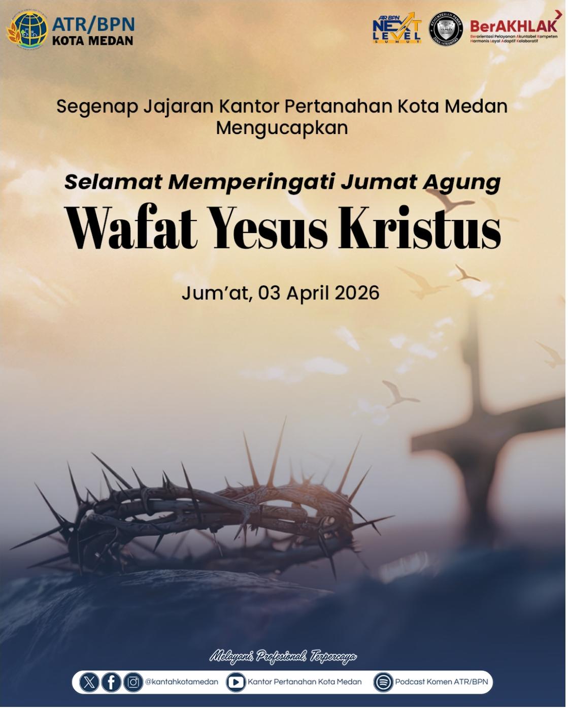 Peringatan Jumat Agung diperingati oleh umat Kristiani sebagai momen refleksi atas pengorbanan dan kasih Yesus Kristus. Dalam kesempatan ini, Kantor Pertanahan Kota Medan turut menyampaikan doa dan harapan agar nilai-nilai pengorbanan, ketulusan, dan kasih dapat terus menjadi inspirasi dalam kehidupan sehari-hari.